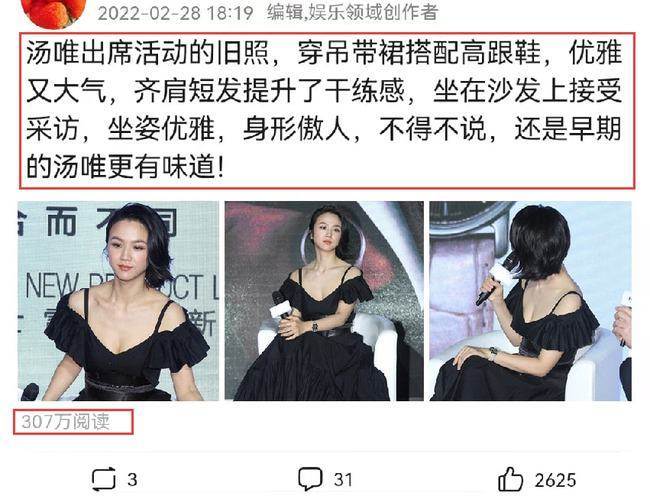 2月28日,有一位娛樂博主在網上發佈了一篇關于湯唯穿吊帶裙亮相的帖子,曬出了一組湯唯穿吊帶裙亮相的照片,並配文「湯唯出席活動的舊照,穿吊帶裙搭配高跟鞋,優雅又大氣,齊肩短髮提升了幹練感,坐在沙發上接受採訪,坐姿優雅,身形傲人,不得不說,還是早期的湯唯更有味道!」看得出來,該娛樂博主對湯唯穿吊帶裙亮相的評價還是挺高的。