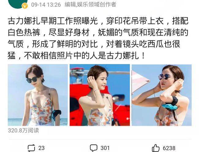9月14日,有一位娛樂博主在網上曬出了三張古力娜紮的舊照,並配文「古力娜紮早期工作照曝光,穿印花吊帶上衣,搭配白色熱褲,盡顯好身材,嫵媚的氣質和現在清純的氣質,形成了鮮明的對比,對著鏡頭吃西瓜也很猛,不敢相信照片中的人是古力娜紮」,這一組古力娜紮早期工作照火了,閱讀量超過了300萬,照片中古力娜紮的形象成為了網友們關注和熱議的焦點。